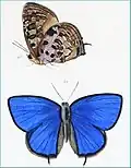 This species being above of a wonderful sky-blue colour exhibits beneath spots and bands of a uniform dark sepia-brown shade on a red-brown ground.[3]
