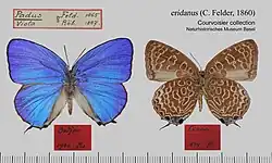 A. eridanus Fldr.is not dissimilar to camdeo, but much smaller. In the male the brightening in the disc of the forewing is not white, but only somewhat lighter sky-blue. Beneath the postmedian bands are broken up into single contiguous rings. ab. dilutior Stgr.,[now subspecies] from Palawan, has in the female a somewhat larger light area in the disc of the forewing, but the male is said not to differ from Amboina males The species varies in the colouring beneath being sometimes more red brown and sometimes more dark brown, whereas the marking remains constant.[3]