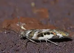 The wingspan is about 13 mm.[3] The base of the forewings is white, iridescent, narrow, but wider on the dorsal than on the costal margin. This is followed by an oblique, ochreous or yellowish-orange band, which crosses the wing and is margined with brown before and behind, and followed by an oblique white band, which also crosses the wing, and is rather widely margined behind by an iridescent, brown line, terminating at a smooth tuft of raised scales on the dorsal margin, the tuft or rather smooth elevation being metallic and highly iridescent, as also are the brown margins of the ochreous bands. The dark brown, posterior margin of the second brown fascia is produced backwards along the disc and passes backwards along the disc, inclining towards, but not reaching the base of the dorsal cilia, and containing three smooth, metallic elevations, like the one on the dorsal margin, the wing between it and the costa being white, and between it and the dorsal margin the wing is white and pale ochreous. The oblique streak terminates just before the dorsal cilia at a curved fascia, which is very convex towards the base, is reddish ochreous on the dorsal margin, and brown on the costal margin. This curved fascia is followed by an oblique one, which is nearest to the tip on the costal margin, and the costal portion of it is wide and white, and the dorsal portion brown, and in some lights is brilliant metallic. The brown portion is narrow where it meets the white costal portion, and passes around behind it to the costal margin, and thence curves as a narrow line backwards around the apex at the base of the cilia, returning to its origin on the dorsal margin, thus enclosing an oblong, egg-yellow or golden patch, parallel with the base of the dorsal cilia. In some lights this fascia is dull brown, not at all metallic, and the yellowish ochreous parts of the wing become almost brick red.[4]