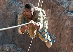 2nd Lt. Kre McMahon, of the Arkansas National Guard, completes the mountain obstacle portion of the French Desert Commando Course in Djibouti, Africa
