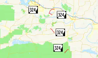 Highway 324 (AR 324, Ark. 324, and Hwy. 324) is a designation for four state highways in the Arkansas River Valley. One route of 0.76 miles (1.22 km) runs from US Highway 64 (US 64) to Tyler Road in Russellville.[2] A second route of 6.85 miles (11.02 km) begins at Highway 105 and runs east around Lake Atkins to terminate at Highway 105.[2] A third route of 4.01 miles (6.45 km) connects Highway 155 and Highway 10 in Perry County.[3] A fourth segment connects Lake Sylvia Recreational Area in the Ouachita National Forest to Highway 9 and the state highway system.[3] All routes are maintained by the Arkansas State Highway and Transportation Department (AHTD).