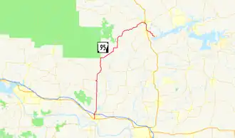 Highway 95 (AR 95, Ark. 95, and Hwy. 95) is a designation for a north–south state highway in north central Arkansas. The route runs 49.40 miles (79.50 km) runs north from US Highway 64 and Highway 113 in Morrilton north to Highway 330.[2][3]