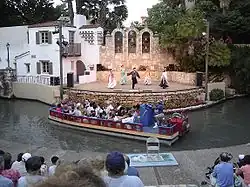 The stage is on the north side of river; the audience sits on the grass-covered steps on the south side, which can hold over 800 people on 13 rows of seats.[1] A nearby stone bridge is often made part of the performance space. It is now called Rosita's Bridge in honor of Rosita Fernández, a pioneer of Tejano music, who performed here as star of the summer-long Fiesta Noche del Rio for 25 years.[4] The theater continues to be used throughout the year for a wide variety of performances averaging over 200 each year including folkloric groups, festivals, music concerts, plays, dance, opera, and even weddings. Many of the river parades held throughout the year are televised from this unique open-air amphitheater. [5]