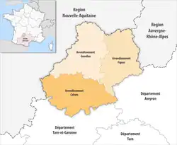 In 1800 the arrondissements of Cahors, Figeac, Gourdon and Montauban were established. The arrondissement of Montauban was ceded to the new department Tarn-et-Garonne in 1808.[2] All of the remaining arrondissements have never disbanded.