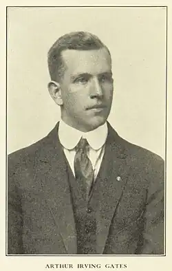 Gates was born in Red Wing, Minnesota to William P. and Lenore Gaylord (who had a son from an earlier marriage). He began to read by the age of three thanks to his mother's teaching. The family moved in 1892 to Fortuna, California where his father worked in a lumber company. He went to local schools and joined the University of California, Berkeley majoring in experimental psychology. He spent a few years of graduate studies and then moved to Columbia University where he obtained his doctoral degree in 1917 and then joined as a teaching fellow. He became a full professor in 1956. He wrote several books on the psychology of reading, the remediation of reading difficulties, and put forward support for the view that children should not be taught reading as an end in itself or as an isolated activity but in the context of things and activities that they find interesting. Some of his students included Ruth Strang, Margaret Mead, Dorothy Van Alstyne, Guy L. Bond, and David H. Russell.[1][2][3] His student Walter H. McGinitie was involved in the creation of the reading test known as the Gates-McGinitie Reading Test.[4]