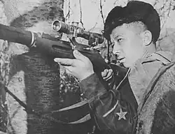He also helped other soldiers learn his sniper craft, training 15 other snipers.[4] A photo of him posing with his sniper rifle taken during the Battle of Kuban was published in the Photonewspaper of the Soviet Navy in issue 9 of 1943.[5]