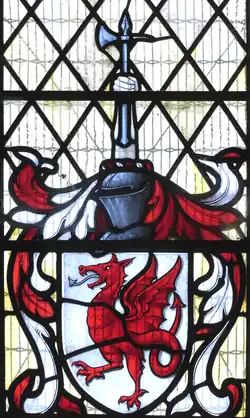 Canting arms of Drake (from Latinized form Draco, "a dragon"[31]) of Ash: Argent, a wyvern wings displayed and tail nowed gules.[32][33] Left: Detail from top of 1611 monument in Musbury Church; right 19th century stained glass, Musbury Church, showing crest: A dexter cubit arm couped at the elbow proper holding a battle-axe sable[34] The Drake motto is: Aquila non captat muscas ("The eagle does not catch flies"). The Drake wyvern gules was adopted by John Churchill, 1st Duke of Marlborough for both his heraldic supporters, in recognition of his maternal descent from the Drakes of Ash