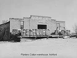 In March 1888, the Alabama Midland Railway built a small depot of Victorian railroad architecture in Ashford to be a waystation along the Bainbridge-to-Montgomery route. The depot was the only building to survive the 1915 fire that destroyed the rest of the town. The original depot received additions at least twice—an enclosed warehouse and open loading dock were added to the east, followed by racially segregated passenger waiting rooms on the west side. The depot faced two sidings that served for loading turpentine from the Adams Company still one block away, and pulpwood. Cotton bales, fertilizer, and a single sweet potato crop were loaded from both sidings.