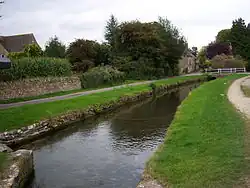 The river forms two channels – making a large square – in the parish, enclosing the western half of the village and in the past powering mills of a modest nature.[32] The south-western channel is joined by the Swill Brook and smaller tributaries join, particularly at the re-convergence of the channels. The Thames' north-eastern channel, the village channel, is deeply entrenched at the places it has frontage to more than 30 of the village's homes and where it is crossed by many flat-deck bridges, some of brick or stone arch. One public bridge, Gumstool Bridge, is not quite flat.[33] Made of limestone it is "probably medieval"; it has two arches, vertical sides rising to form a parapet 80 cm high, triangular copings and a raised, squared apex.[33] Two other bridges are consistent with a slightly pre-1800 date.[34] The manor house and adjacent church farm enjoy the vestige of a moat, its southern limb; the rest was intact for many centuries, as seen in maps of the 19th century.