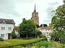 The parish church of St Mary the Virgin dates almost entirely from the 14th century and is renowned for its ornate church tower which stands at 176 feet (54 m), and is crowned by an octagonal lantern with a leaded 'spike'.[2] The church contains medieval graffiti carved on its walls which highlight the plight of survivors of the bubonic plague pandemic known as the Black Death. There is also a graffito depiction of Old St Paul’s Cathedral.