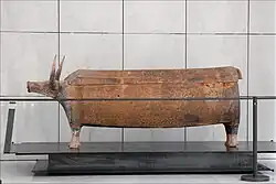 This zoomorphic sarcophagus, or erong, from the art of the Toraja Sa'dan, an important people of Sulawesi island in Indonesia, represents a water buffalo, a domesticated and sacrificial animal.