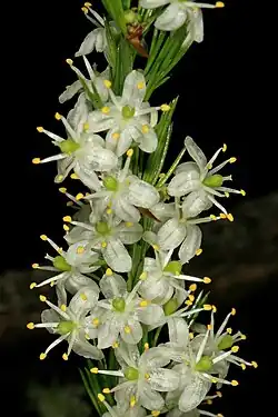 The plant produces white flowers, which, like the leaves, grow in clusters.[2] They have three sepals and three petals, which are similar in appearance. The six white filaments have yellow anthers.[4] Flowers are present between August and December in the Southern Hemisphere.[2] The colour and the scent of these flowers attract insects, which pollinate the flowers.[4]