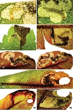 The leaf mine begins with a linear portion that follows the midrib of the leaf towards the leaf tip, eventually widening into a small blotch that extends from the midrib to the edge of the leaf. The frass of the larvae is blackish. When mature and ready to pupate, the larvae cut out a 2.5–3.5 mm (0.098–0.138 in) long case from their host leaf, leaving an elliptic hole.[1]