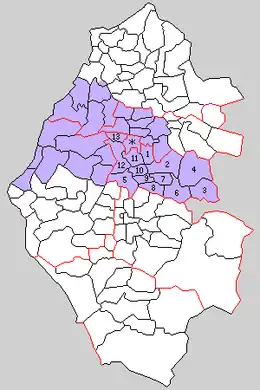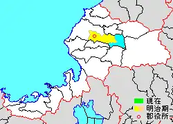 * yellow - areas formerly within the district borders during the early Meiji period