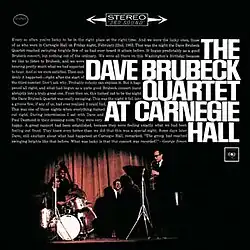 At Carnegie Hall is a jazz live album by the Dave Brubeck Quartet. It was recorded at the famed Carnegie Hall in New York City on Friday, February 22, 1963. Critic Thom Jurek described it as "one of the great live jazz albums of the 1960s".[1] Critic Jim Santella wrote, "This is timeless music from a classic ensemble. Goosebumps are guaranteed."[3]