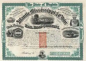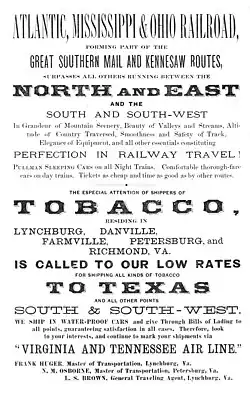 Atlantic, Mississippi and Ohio Railroad (AM&O) was formed in 1870 in Virginia from three east–west railroads which traversed across the southern portion of the state. Organized and led by former Confederate general William Mahone (1826-1895), the 428-mile (689 km) line linked Norfolk with Bristol, Virginia by way of Suffolk, Petersburg, Lynchburg, and Salem. The AM&O was promoted as a trade link to the west, and further expansion was envisioned with the goal of increasing Virginia's Ohio Valley and Mississippi Valley commerce. It was heavily backed by investors from England and Scotland.