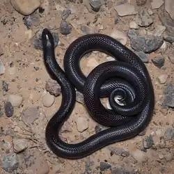 It is an extremely venomous and dangerous snake native to the Middle East. Its body is usually dark black in color and it has small eyes with round pupils. The head and the tail are short and pointy, which makes it harder even for veterans to distinguish head from tail. Its approximate size is 60–80 cm. As a defense it rolls with its tail up and its head hidden under its body.