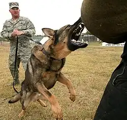 Attack dog training is a variation of sentry dog training, only instead of bringing attention to an intruder, is trained to chase, hold and injure, or possibly kill, a perceived hostile target.[8] Attack dogs are trained to interpret a situation and react accordingly. In formal training, the dogs are exposed to gunfire, traffic and other distractions to increase their effectiveness.[9] Attack training is condemned by some as promoting ferocity in dogs; a 1975 American study showed that 10% of dogs that have bitten a person received attack dog training at some point.[10] Dogs trained for military use as attack dogs, most often called patrol dogs, can be trained to perform explosives detection as well. Military contractors have been supplying the Department of Defense with nearly as many patrol and explosives detection dogs as the government trains in the recent wars in the Middle East.[11]