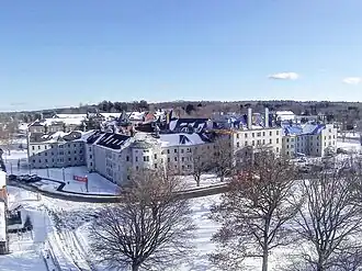 Numerous buildings and new wings were added over the years to the Hospital campus. By 1920, the total area of the hospital property, including the farm and grounds, was approximately 600 acres, of which 450 acres were under cultivation. Patients worked on the farm and in the laundry. The buildings are reflective of changing trends in the treatment of the mentally ill over that period of time.[2] The oldest portions of the complex are known as the Administration and Stone Buildings. Now at the center of a series of connected buildings, they were built in 1836–40 to a design by Hallowell architect John Lord. To these were added stepped wings (in keeping with the then fashionable Kirkbride Plan) in the 1850s and 1860s; these were designed by Francis H. Fassett, with later alterations designed by George M. Coombs. In the 1880s, when "pavilion housing" prevailed as the preferred method for housing the mentally ill, a number of smaller outlying buildings were added, based on a master plan developed by Francis Fassett in the 1870s. The pavilion housing plan proved uneconomical for the large numbers of patients, and dormitory-style buildings were built, combining patient wings, housing for workers, and an administrative hub. The campus also includes a number of utilititarian service buildings, and was landscaped to provide an attractive environment to the patients.[2]