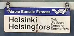 The Aurora Borealis Express is an overnight express train operating between Helsinki and Kolari in Finland. The train travels via many major cities and towns in Finland, and stops at most of them. The total distance is a little under 1000 kilometers, and lasts for 14½ hours to 16 hours depending on direction and season. [2] The service is bi-directional, with a corresponding train operating southwards over the same route.[3]