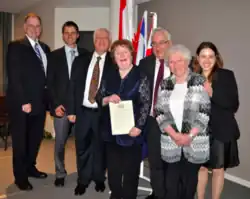 AHMA 2010 recipient Eva Marks with ceremony speakers. From left to right: Prof. Paul Bartrop, Master of Ceremony from the Austrian Service Abroad Daniel J. Schuster, Austrian ambassador to Australia Dr. Hannes Porias, Awardee Eva Marks with a Letter of Congratulations from the prime minister of Australia Julia Gillard, Australian MoP Michael Danby, Auschwitz Holocaust survivor Saba Feniger, Israeli diplomat to Australia Einat Weiss
