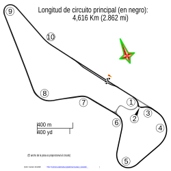 Autódromo Ciudad de Nueve de Julio - Guillermo Yoyo Maldonado is a 4.649 km (2.889 mi) circuit located in Nueve de Julio, Argentina.[1][2] It has hosted national events, such as TC2000 Championship, Top Race V6 and Turismo Nacional. On the 50th anniversary of circuit, the circuit was renamed as Autódromo Ciudad de Nueve de Julio - Guillermo Yoyo Maldonado as a tribute for native racing driver Guillermo Yoyo Maldonado.[3]