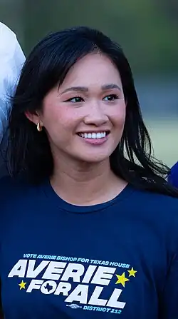 Averie Bishop is a social activist who is the first Asian American woman to be crowned Miss Texas. Her work focuses on diversity, equity, and inclusion, and she co-founded a nonprofit supporting educational access for underserved communities. She was the second-runner up at Miss America 2023, and ran as the Democratic Party's candidate for Texas's 112th House of Representatives district in the 2024 elections.