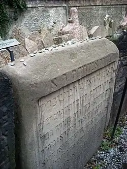 He wrote in both Hebrew and Yiddish.[6] He was a composer of hymns.[3] His most famous poem, entitled Et Kol Hatela'ah Asher Meza'atnu or "All the Hardships that Befell Us" or "All the Trouble That Has Found Us" was an elegy concerning the Easter pogrom that took place in Prague in 1389. He died in 1439 and is buried in the Old Jewish Cemetery, Prague, of which his is the oldest identified grave.[7][8][9][10][11] The elegy he wrote has become part of mahzors and Yom Kippur services.[12] It was cited by David Gans. He is considered the last Ashkenazi payyetan, or composer of piyyutim or liturgical poems, of which 8 survive.[13]