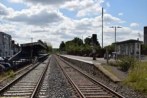 The station is on a north-west/south-east alignment, with two platforms separated by two running lines. The southern "up" platform, adjacent to the "Up Main" line, is used for trains towards Severn Beach. The northern "down" platform, adjacent to the "Down Main" line, is bidirectionally signalled, allowing it to be used by terminating trains and those heading towards Bristol. Both platforms have significant portions of their length fenced off, giving usable lengths of 91 yards (83 m) for the southern platform and 70 yards (64 m) for the northern.[7]