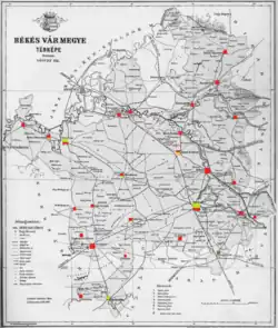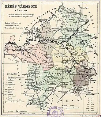 Békés county shared borders with the Hungarian counties Csongrád, Jász-Nagykun-Szolnok, Hajdú, Bihar, Arad and Csanád. The river Körös flowed through the county. Its area was 3,670 km2 around 1910.
