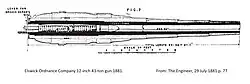 On 24 May 1880, the government ordered a competing 12-inch 43-ton gun at Elswick Ordnance Company (EOC). Manufacture of this gun lasted from June 1880 to August 1881.[19] The Elswick 43-ton was tested in August 1881.[15] A drawing of the gun showed that its tube was coiled till the muzzle.[20]