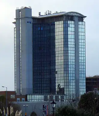 The BT Tower (Welsh: Tŵr BT) is located near Swansea Castle and is the second tallest building in Swansea after The Tower, Meridian Quay. It has 13 floors and is 63 metres (207 ft) high.[1] Completed in 1970 by the General Post Office,[1] the BT Group uses it as an office building.