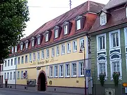 The Badischer Hof (in English Court of Baden) is the oldest hotel in Tauberbischofsheim. In 1733 it was built as the former Adelshof by the knight Anton Phillip von Fleischmann. Later, it was as a post office. In 1811 it received its present name: Badischer Hof. In 1894 a hall with large arched windows was added.[1] In the hotel there is also a nostalgic movie theater. The house was obtained externally faithfully and since eight generations it belongs to the family Derr. It is a listed building.[1]