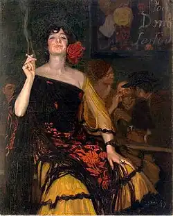 After four years, he returned to Barcelona. In addition to his paintings, he provided illustrations for several notable publications, including L'Esquella de la Torratxa.[1] Many of his drawings were signed "L'Alegret" (possibly a reference to Alegret, the Gascon troubadour). He also tried his hand at being a playwright. In 1909, the Teatre Apolo premiered his musical comedy La Canción de la Ninfa; written under the nom-de-plume "Emilio Roig", with music by Pedro Enrique de Ferrán.[2]
