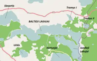 Its total area is 6.998 km², its length is 8.6 km and its maximum width is 1.3 km.[5] The lake has three islands which cover an area of 3.8 hectares. Along the waterhole is a 40–50 m deep ravine.[6] The coastline of the lake has a total length of 24.5 km, and has many coves, bays and peninsulas.[6] It is a relatively shallow lake with a maximum depth of 45 metres, narrow, and almost no beaches.[6] Pine forests line the shores in most parts.[6] The smaller Tramys lakes are just to the northeast, to the west is Lake Siesartis, and to the south (from west to east) is Lake Urkis, Lake Kertuojai and Juodieji Lakajai.[7] The lake can be accessed by foot via Highway 114 from the north and Highway 173 from the southwest and is quite popular with vacationers.[6]