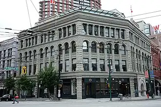 When the bank opened in July 1910, BC was in the midst of an industrial and real estate boom with investment funds readily available from world capital markets. The first branch and headquarters were in the Flack Block on the corner of Hastings and Cambie streets.[1] The issued capital was $1,169,900 and paid-up capital $830,000. By 1913, the bank had four branches in Vancouver, two in Victoria and individual ones in New Westminster, Collingwood, Cedar Cottage, Coquitlam, Hazelton, Fort George,[3] and Fort Fraser.[4] The Chilliwack and Broadway (Cedar Cottage) branches closed in 1912 and 1913 respectively.[1]