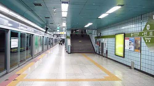 Banpo Station is a metro station on Seoul Subway Line 7 located in Jamwon-dong, Seocho District, Seoul. Despite its name, the station is not located in Banpo-dong, but instead in Jamwon. It has 6 entrances that they are all right side entrance and they have screen doors right before entering the train. It takes 4~8 minutes between 2 trains and next stations are Nonhyeon and Seoul Express Bus Terminal. It is only 500m long between Banpo station and two other Stations next to it. The station number is 733.