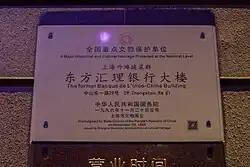 In 1989, The Banque de l'Indochine building was designated as an 'Outstanding Historical Building of Shanghai' by the Shanghai Municipal People's Government, in the first batch of such designated buildings.[12][13][14]