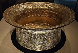 The Baptistère de Saint Louis is an object of Islamic art, made of hammered brass, and inlaid with silver, gold, and niello. It was produced in the Syro-Egyptian zone, under the Mamluk dynasty by the coppersmith Muhammad ibn al-Zayn. This object is now in the Islamic Arts department of the Louvre under inventory number LP 16.[1] Despite its common name, it has no connection with the King of France Louis IX, known as Saint Louis (1214–1270). It was used as a baptismal font for future French Kings, making it an important Islamic and French historical object.