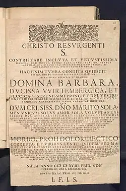 Barbara died in Stuttgart on 8 May 1627, at the age of 33. At her funeral ceremony, the Threnodiae composed by court organist Eusebius Veit were performed.[2] She was buried at the castle church of Pforzheim, where there is an epitaph to Barbara of Württemberg engraved in the floor of the choir.[5]