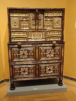 In cabinetry, the bargueño (or vargueño, both pronounced [baɾˈɣeɲo]; meaning "from Bargas") is a form of portable desk, made up of two chests, the bottom one usually having drawers (called a taquillón) and the top one having a hinged desk surface which also serves as a side-mounted lid. It is basically a chest or box with one of the side panels, rather than the top panel, serving as a fold-out writing surface. The interior of the desk is equipped with small drawers, pigeonholes, etc., for storing papers and supplies. The bargueño has also been used for sewing or as a jewel chest.
