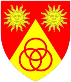 Per chevron Gules and Or in chief two suns in splendour of the last and in base three annulets one and two interlaced of the first.