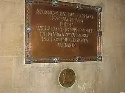 Noble memorial plaque ("peace restored 1919") with below a Memorial Plaque in Westminster College, Cambridge