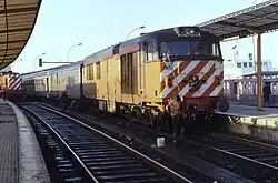 Barreiro is a railway station on the Alentejo Line that serves as a connection between rail services on the South Bank of the Tagus and Soflusa's river transport to Lisbon, Portugal. The first Barreiro station began operating on June 15, 1857,[1] although it was not inaugurated until February 1, 1861.[2] Since it was too far from the river pier, a new station was built and inaugurated in 1884.[3] This station included an important workshop hub, which underwent extension work during the 1900s,[4] but the facilities were becoming insufficient for the demand by the following decade.[5] However, political and social instability, which was reflected in the administration of the railroads, dragged out the process. It was not until the 1930s that the new workshops were completed.[6] Meanwhile, in 1923 the Ramal do Seixal branch line went into service,[7] and in 1935 the railway between Barreiro and Lavradio was duplicated.[8] The Barreiro station was remodeled and expanded in 1943,[3] and in the 1950s the workshops began to house diesel locomotives from other lines that had been electrified.[9] On December 14, 2008, a new Barreiro station was inaugurated, and the old one was closed.[10][11]
