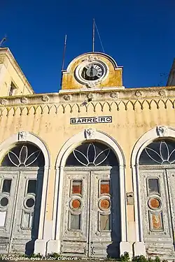 In 2004, it had a public support service for the National Railway Network, and four manoeuver tracks.[19] The station was equipped with a distribution center, to sort mail transported by rail, having its own stamp.[20] This Barreiro station served as a connection between trains from the region south of the Tagus River, and as a fluvial port for passengers and goods, with connections to Lisbon.[21][22] It was taken out of service with the construction of the new structure in 2008,[10][11] and the building was left in disrepair.[23] It was declared in 2018 as having a "under classification" status (Diário da República 2nd Series, No. 30 of February 12) in the listing process of the Barreiro Railway Complex.[18]
