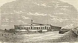 The first station (1861-1884) was housed in a large building, with a frontage of approximately 65m wide, 16 spans for windows and doors, and three gates.[1][16] The station was relocated in 1884 to the future South and Southeast terminal after complaints from several passengers who needed to cross two kilometers of sandy beach to gain access to the river terminal.[17] The building was maintained and later integrated into the Empresa de Manutenção de Equipamento Ferroviário, S.A. (EMEF) Barreiro workshop complex.[18]