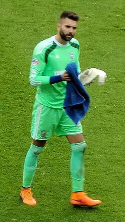 On 15 July 2014, Białkowski signed a two-year deal with Ipswich Town.[31] He marked his Town league debut with a clean sheet in a 2–0 win at Blackpool on 1 November 2014. He kept his place for the majority of the season as Town reached the Championship play-offs, but was left out of the team for compassionate reasons following the death of his father in August 2015. He made 35 appearances during his first season at Portman Road, keeping 9 clean sheets.[32] Fellow goalkeeper Dean Gerken's form kept him out of the team until he was injured in early 2016 and Białkowski returned with a string of impressive performances which saw him win consecutive player of the month awards and then both the Supporters' Player of the Year award and the Players' Player of the Year award for the 2015–16 season.[33] He kept 8 clean sheets in 23 appearances over the course of the season.[34]