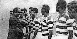 Bashir sitting second from left with the East Pakistan football team in 1963 before an exhibition game against China (above), shaking hands with Minister A.T.M Mustafa (below) prior to an exhibition game against Fortuna Düsseldorf.