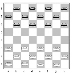 • Starting position. Each player starts with 12 pieces on the dark squares of the three rows closest to their own side. The row closest to each player is called the "crownhead" or "kings row". Usually, the colors of the pieces are black and white, but it is possible to use other colors (one dark and other light). The player with white pieces (lighter color) moves first.