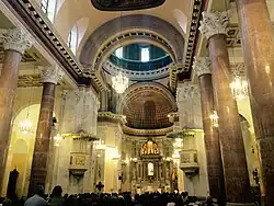 The origin of the location of the Basílica da Penha dates back to a small oratory located "Outside the Gate of Santo Antônio", corresponding, with a slight difference, to the plot of land where today the contemporary building is erected. The oratory was instituted in 1655 by the French Capuchin Franciscans and expanded on April 16 of the same year, in a plot donated by Belchior Alves Camello and his wife Joanna Bezerra. However, the present temple was constructed between the years of 1870 and 1882, being the only church in Corinthian style of the Pernambuco State. It is inspired by the architecture of the San Giorgio Maggiore church of Venice. In 1870, the Capuchins of Veneto (Italy) demolished the old Church of Penha and erected the imposing and current Basilica da Penha, concluding the work in 1882.[5] On September 2, 2007, a restoration work began that lasted until July 4, 2014, the date of its re-inauguration. The works cost about R$6 million and have not yet finished.[6] The work of the restorers revealed several features that had been lost by the passage of time. The original color of the gilded saint above the external dome has been restored and a vitrified panel of mosaic made in Italy has been found.[7] The church is known for the traditional event of the Blessing of Felix of Cantalice which took place close to the Basilica while the restoration lasted.[8]